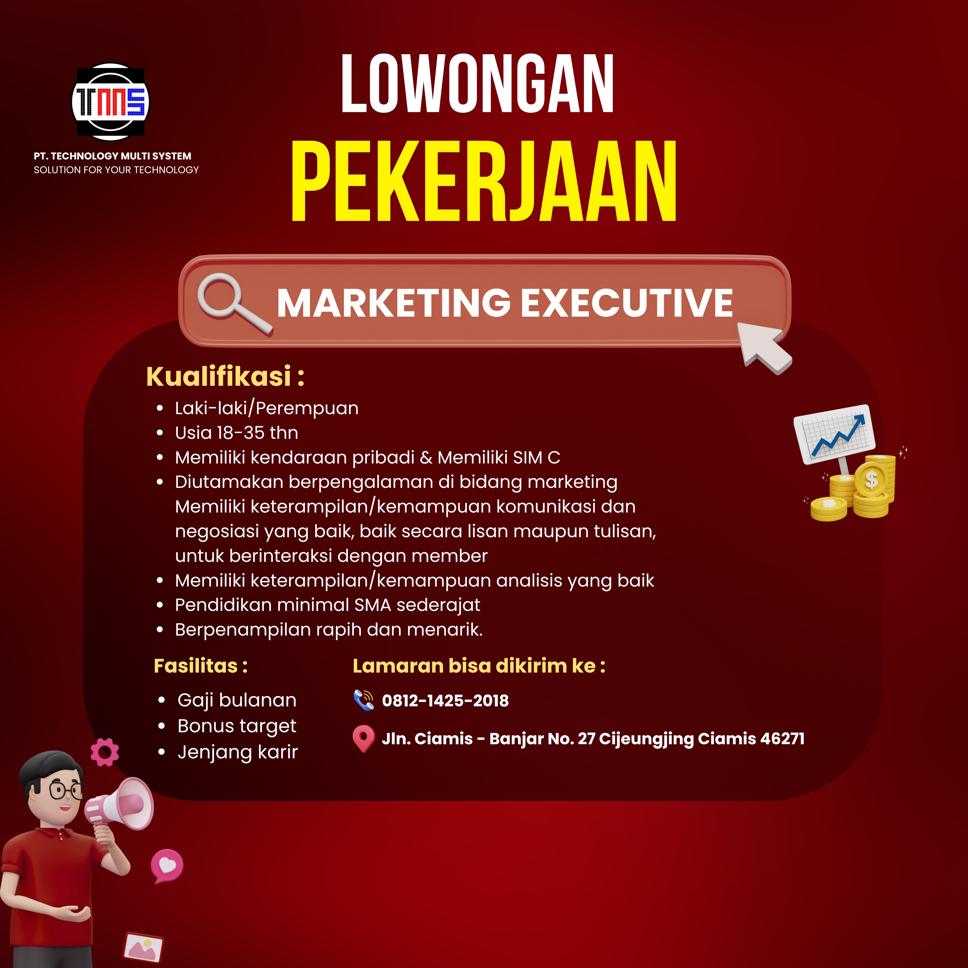 PT. Technology Multi System (TMS) membuka lowongan kerja Full Time atau Part Time di berbagai wilayah di indonesia khusus untuk bagian marketing, Untuk membantu masyarakat mendapatkan penghasilan dan pekerjaan. Bagi anda yang berminat untuk melamar pekerjaan sebagai marketing di perusahaan kami, silahkan klik tombol "Ajukan Lamaran" di bawah ini dan kami akan menghubungi anda secepatnya untuk konfirmasi jadwal interview dan training.